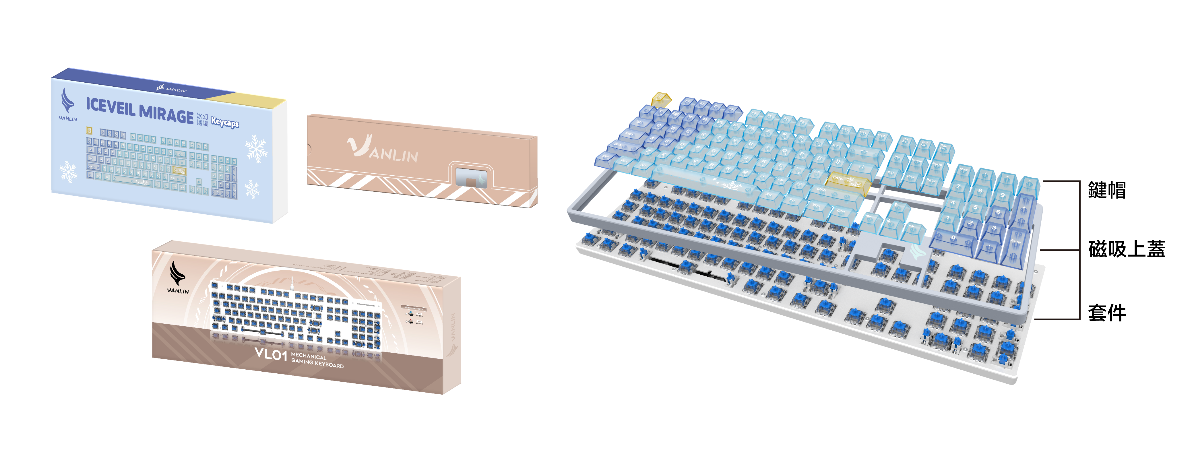 此商品包含:VL01白色套件+冰璃幻境鍵帽+VL01珠光藍上蓋
