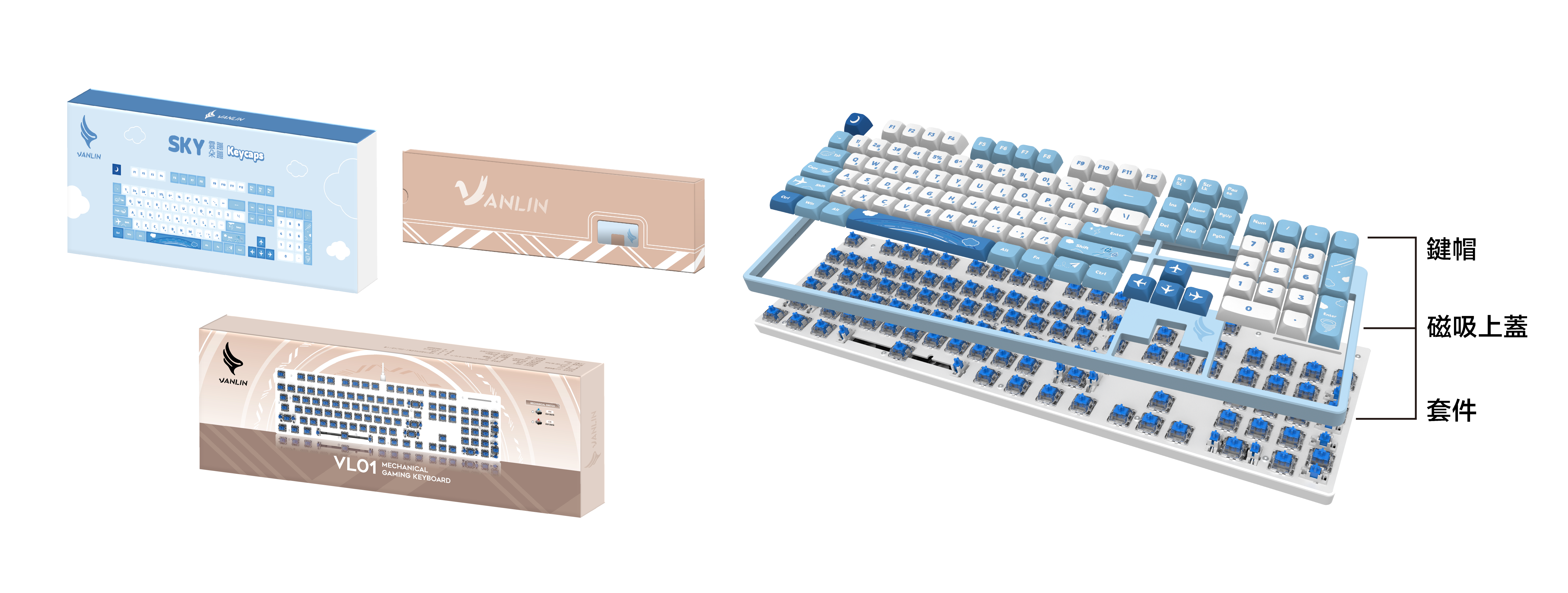 此商品包含:VL01白色套件+雲朵蹦蹦鍵帽+VL01藍色上蓋